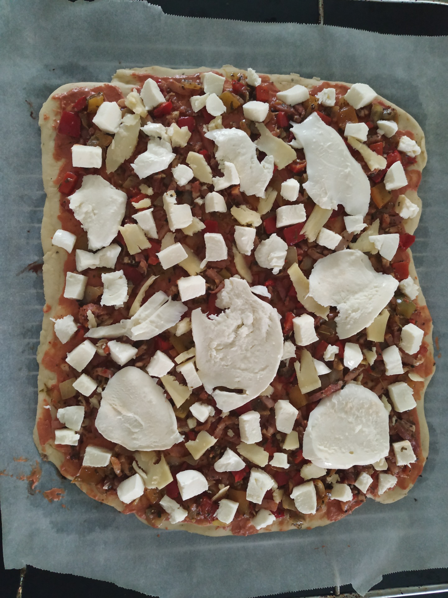 Étalez la pâtes. Mettre la sauce tomates puis éparpillez les oignons, les lardons, les poivrons, les lamelles de pommes de terre et de mozzarella. Dispersez du fromage à pizza. Finissez par un filet d'huile d'olive.